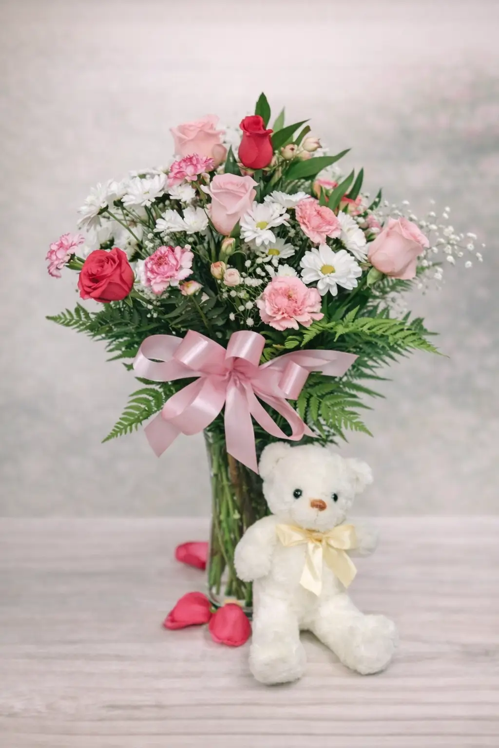 Crafted with attention to detail, this arrangement not only showcases the beauty of nature but also expresses heartfelt sentiments. Perfect for gifting or as a delightful centerpiece in your home, it’s a wonderful way to show someone how much you care. Make their day memorable with this enchanting combination of flowers and a cuddly companion!