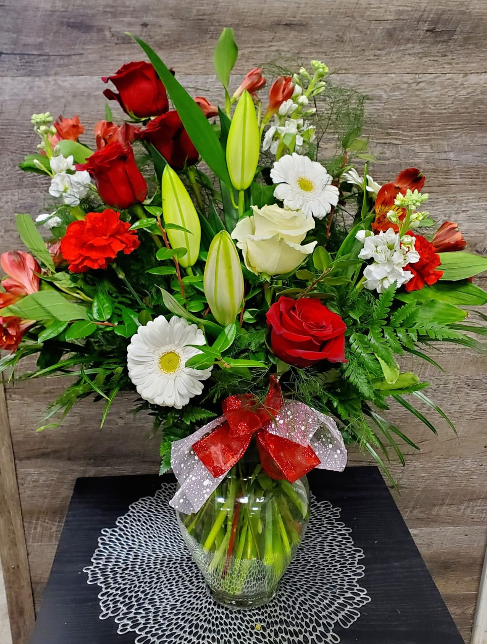 Beautifully designed to capture the spirit of the holidays, this arrangement blends rich reds and crisp whites for a striking centerpiece or thoughtful gift. Perfect for brightening your home décor, sending warm wishes, or adding a touch of seasonal cheer to any celebration.