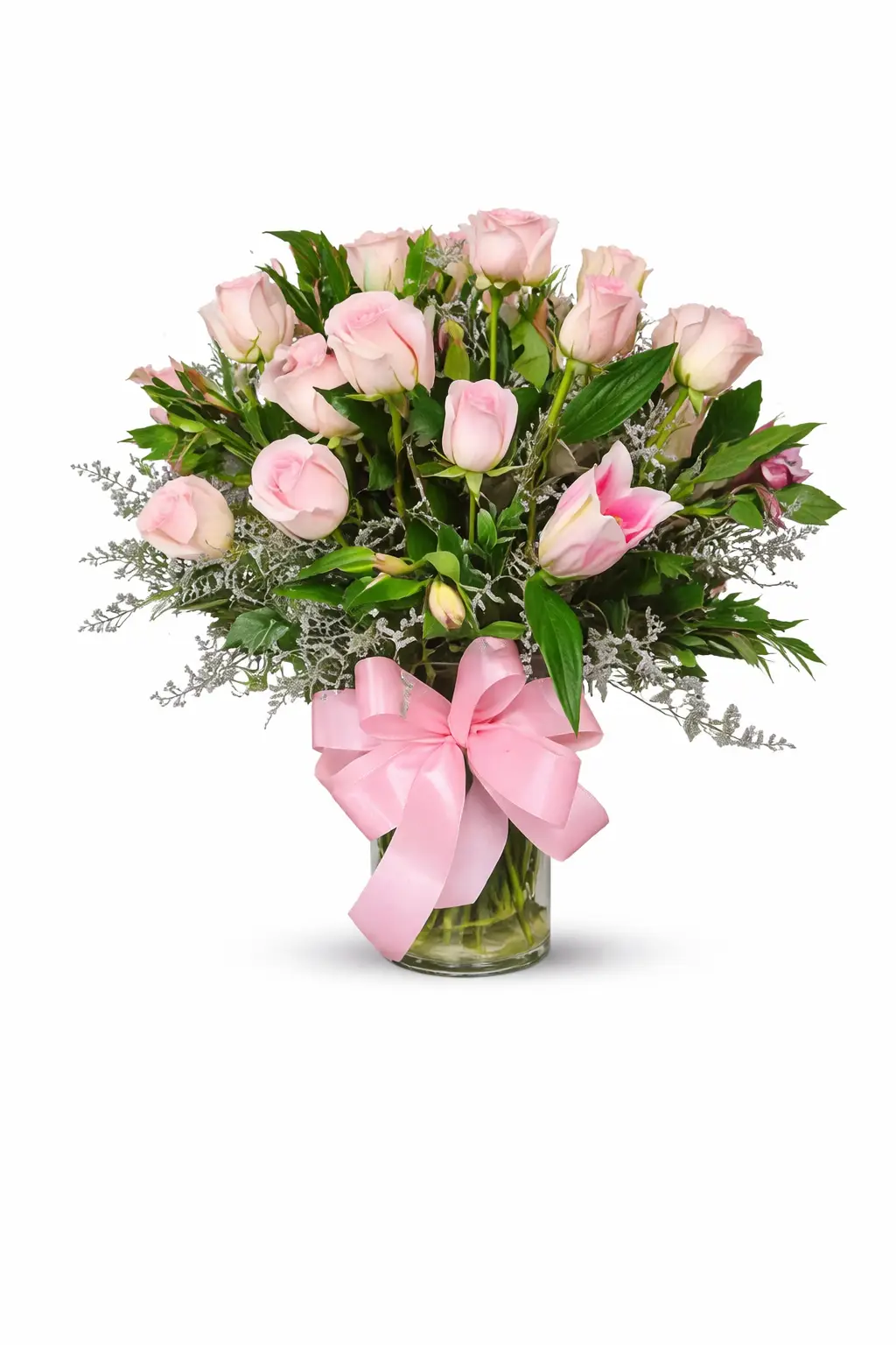 Introducing our Premium Floral Arrangement, a stunning blend of elegance and grace. This exquisite display features a dozen lush pink roses, each petal a testament to timeless beauty. Complementing the roses are delicate lilies, their soft fragrance adding an enchanting aroma to your space.