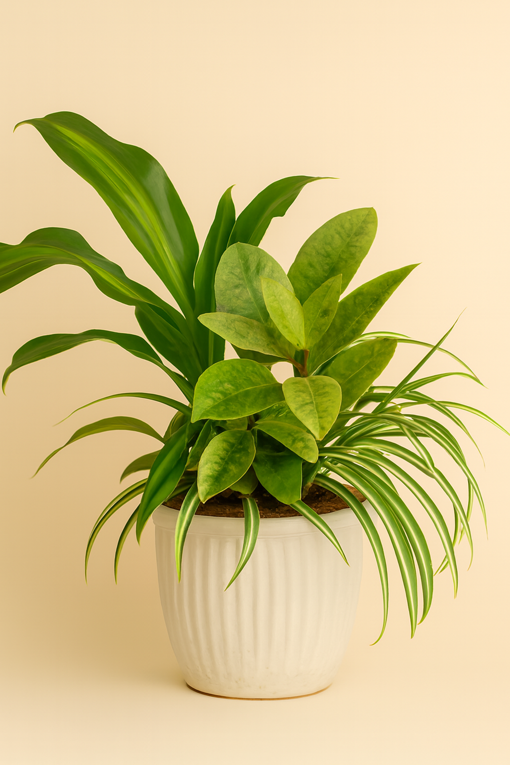 Bring vibrant greenery into your space with this lush indoor arrangement, artfully styled in a white textured ceramic planter. This low-maintenance display features a trio of popular houseplants: